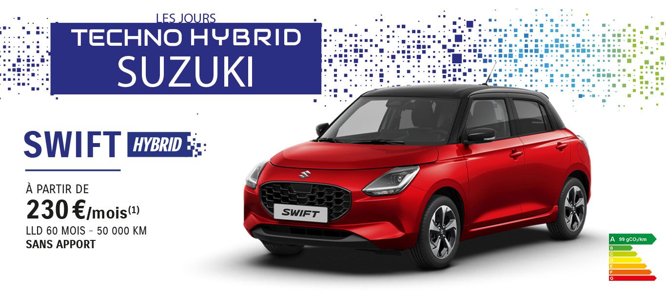 (1) Exemple pour Suzuki Swift 1.2 Hybrid SHVS Avantage neuve, hors options, en Location avec Option d'Achat sur 60 mois et 50 000 km maximum. Sans apport, 60 loyers mensuels de 230€ TTC. Offre réservée aux particuliers et valable du 01/02/2026 au 28/02/2026 pour toute commande d'une Suzuki Swift 1.2 Hybrid SHVS Avantage neuve. Sous réserve d’acceptation du dossier par CGL, Compagnie Générale de Location d’équipements, SA au capital de 58 606 156 € - 69, av. de Flandre 59708 Marcq-en-Baroeul Cedex - SIREN 303 236 186 RCS Lille Métropole
